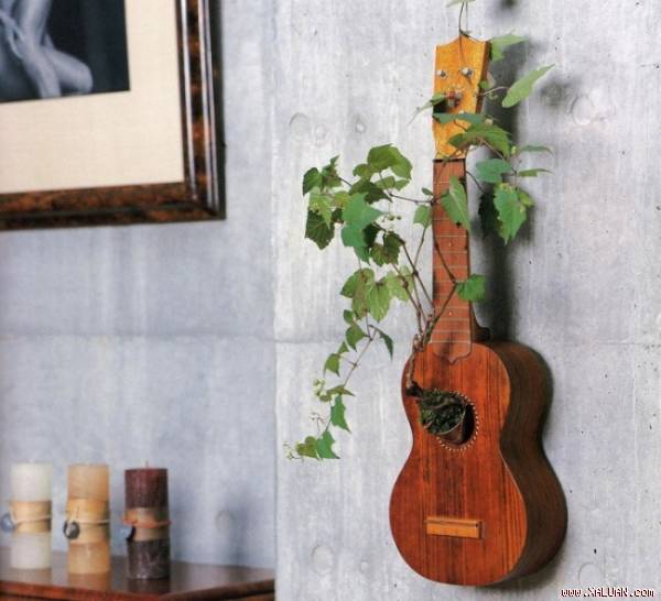 Một chiếc đàn guitar cũ có thể trở thành nơi trồng cây độc đáo có một không hai. Hãy đổ đất vào trong hộp đàn và trồng cây từ lỗ tròn trên đàn, sau khi đã tháo bỏ các dây đàn. Cây leo như vạn niên thanh là một ý tưởng tuyệt vời để kết hợp với chiếc "chậu cây" thú vị này. Không gì lãng mạn bằng một góc tường treo cây đàn guitar, từ đó những thân cây uốn lượn và bám trên mảng tường xung quanh. Đó vừa là chậu cây, vừa là món đồ thú vị để bạn trang trí tường nhà.
