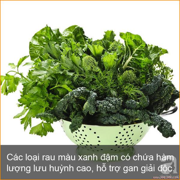 Cải xoăn, cải bruxen, bắp cải có chứa hàm lượng lưu huỳnh cao, hỗ trợ gan giải độc, kích hoạt việc loại bỏ các gốc tự do và các hóa chất độc hại khác. Bồ công anh được biết đến như một loại rau có lá màu xanh đậm có hiệu quả nhất trong việc hỗ trợ giải độc gan. Chất taraxacin có trong bồ công anh giúp kích thích các cơ quan tiêu hóa, kích hoạt gan và túi mật để giải phóng mật, hỗ trợ tiêu hóa và hấp thụ chất béo.