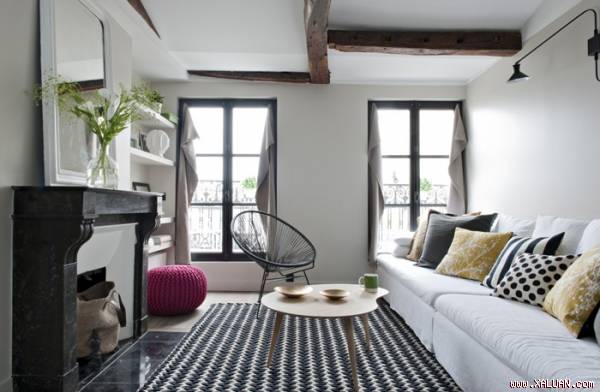 Khi mua lại căn hộ, gia chủ vẫn giữ nguyên vách ngăn bằng gỗ và dầm được gắn trên trần nhà tạo nên điểm nhấn nổi bật, mang đến không gian gần gũi, thân thiện khi nhìn vào không gian. Bắt đầu cải tạo từ căn phòng tiếp khách, những màu sắc nhấn được lấy gốc từ màu của gỗ đã có sẵn như màu đen xám, ghi của rèm. Màu trắng vẫn được chọn lựa ưu tiên làm màu nền giúp căn phòng cải thiện đáng kể về diện tích.