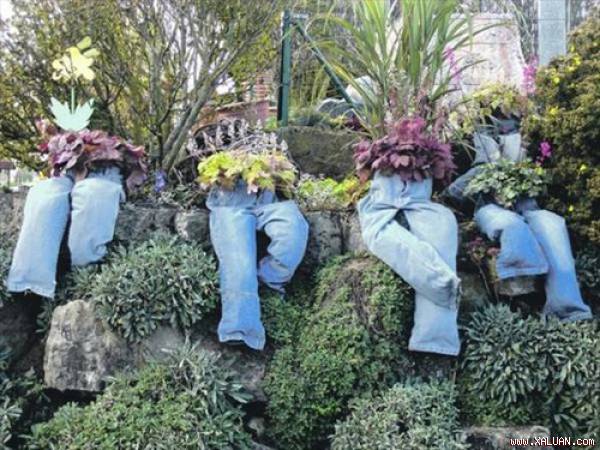 Bạn có thể tự chế các bình cây đặc biệt này bằng cách khâu phần ống quần lại. Bạn nhồi cỏ hoặc các đồ bỏ đi để phần dưới có thể đứng vững rồi cho đất hoặc đặt bình cây phía trên cạp quần.