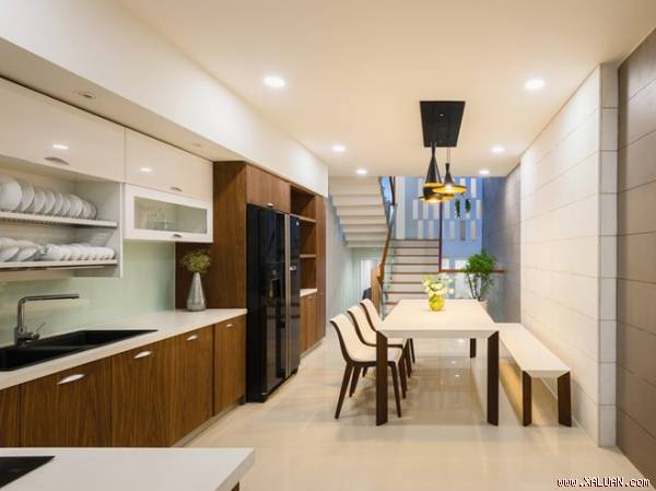 Căn bếp được thiết kế hiện đại với bộ bàn ăn trắng làm điểm nhấn cho ngôi nhà.