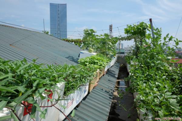 Sân thượng nắng chói chang nhưng vườn nhà chị Thu (Ba Đình, Hà Nội) vẫn xanh mướt, trĩu quả.